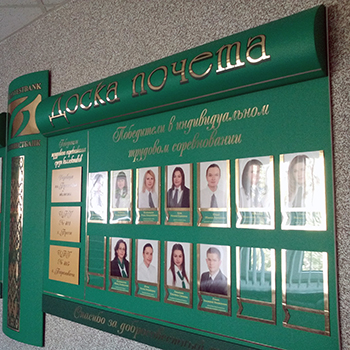 Доска почета — немаловажный элемент на каждом предприятии. Мы изготавливаем доски почета разной конфигурации: Все стенды Доска почёта по своему содержанию и оформлению примерно одинаковы – все содержат фотографии и описательную часть, но по месту размещения и соответственно – по условиям эксплуатации доски почета весьма различны. Различают следующие виды стендов «Доска почёта»: